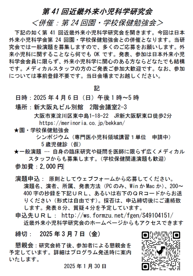 下記の如く第41回近畿外来小児科学研究会を開きます。今回は日本外来小児科学会第24回園・学校保健勉強会との併催となります。当研究会では一般演題を募集しますので、多くのご応募をお願いします。外来小児科に関することなら何でもOKです。発表、参加は日本外来小児科学会会員に限らず、外来小児科学に関心のある方ならどなたでも結構です。メディカルスタッフの方のご発表ご参加大歓迎です。なお、参加については事前登録不要です。当日会場までお越しください。